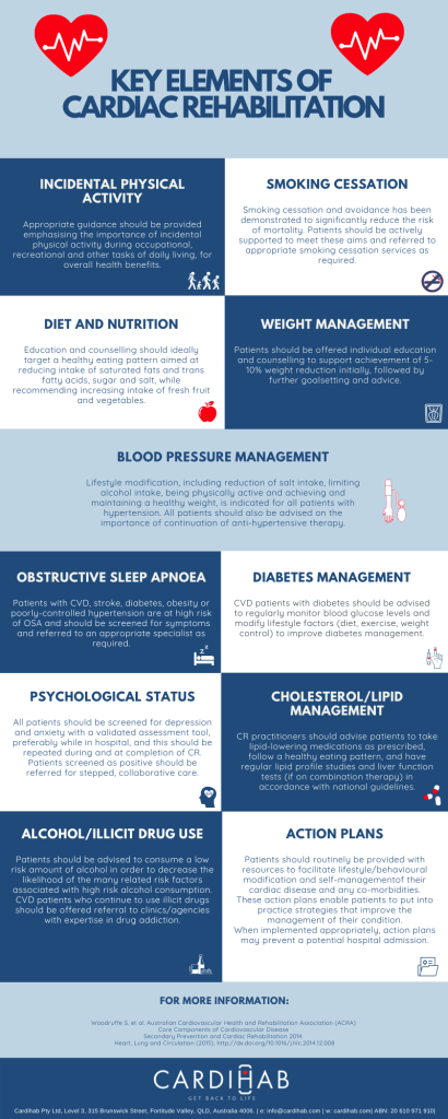 Infographic describing the core components of cardiac rehabilitation in Australia